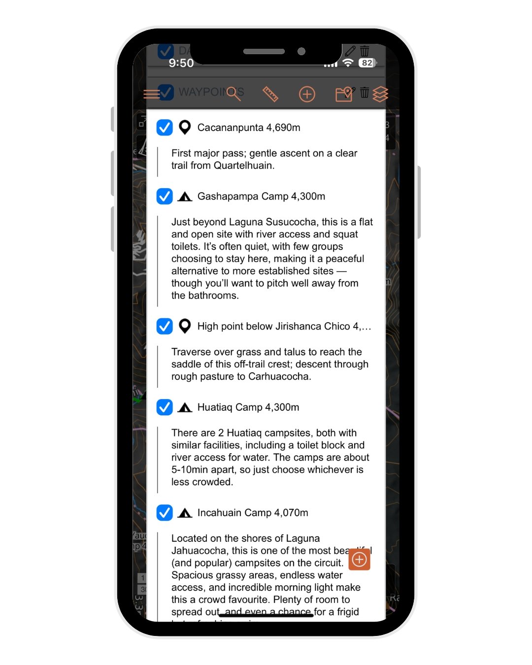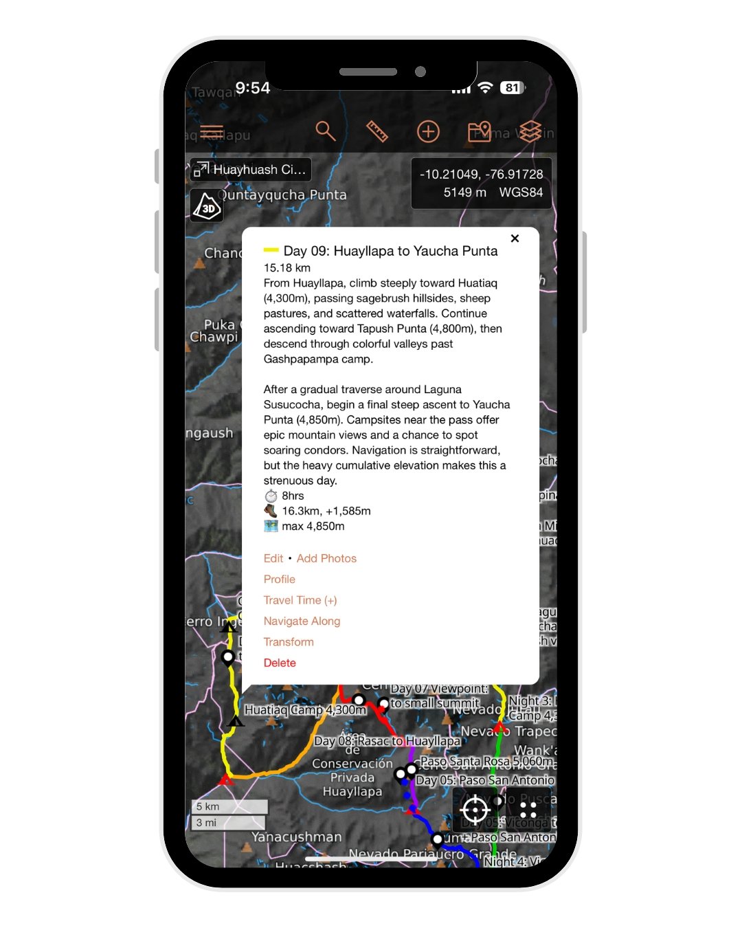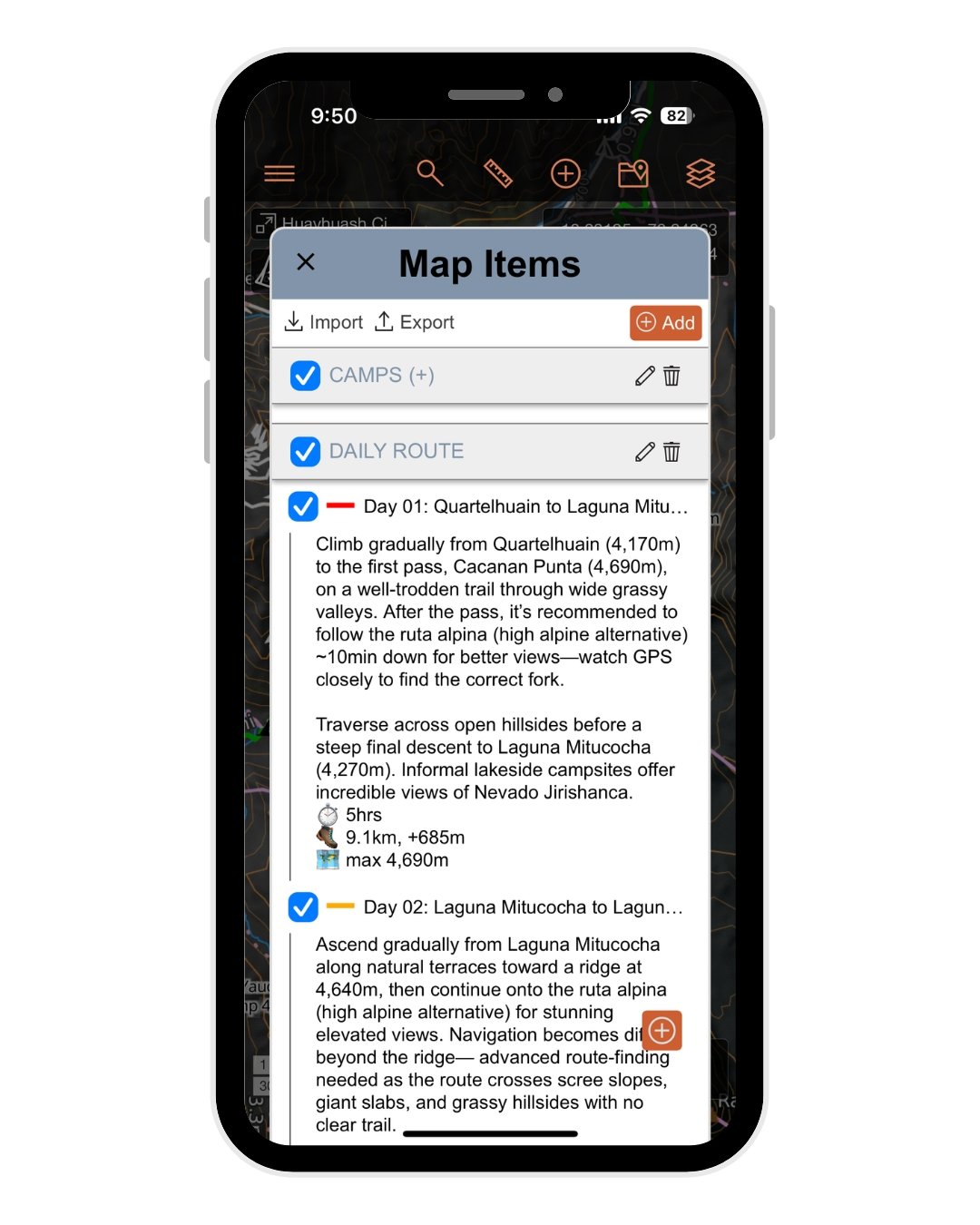 • 41 total map items, including daily tracks, high passes, campsites, side trips, & other key waypoints to help you navigate the entire route